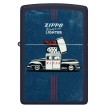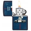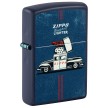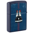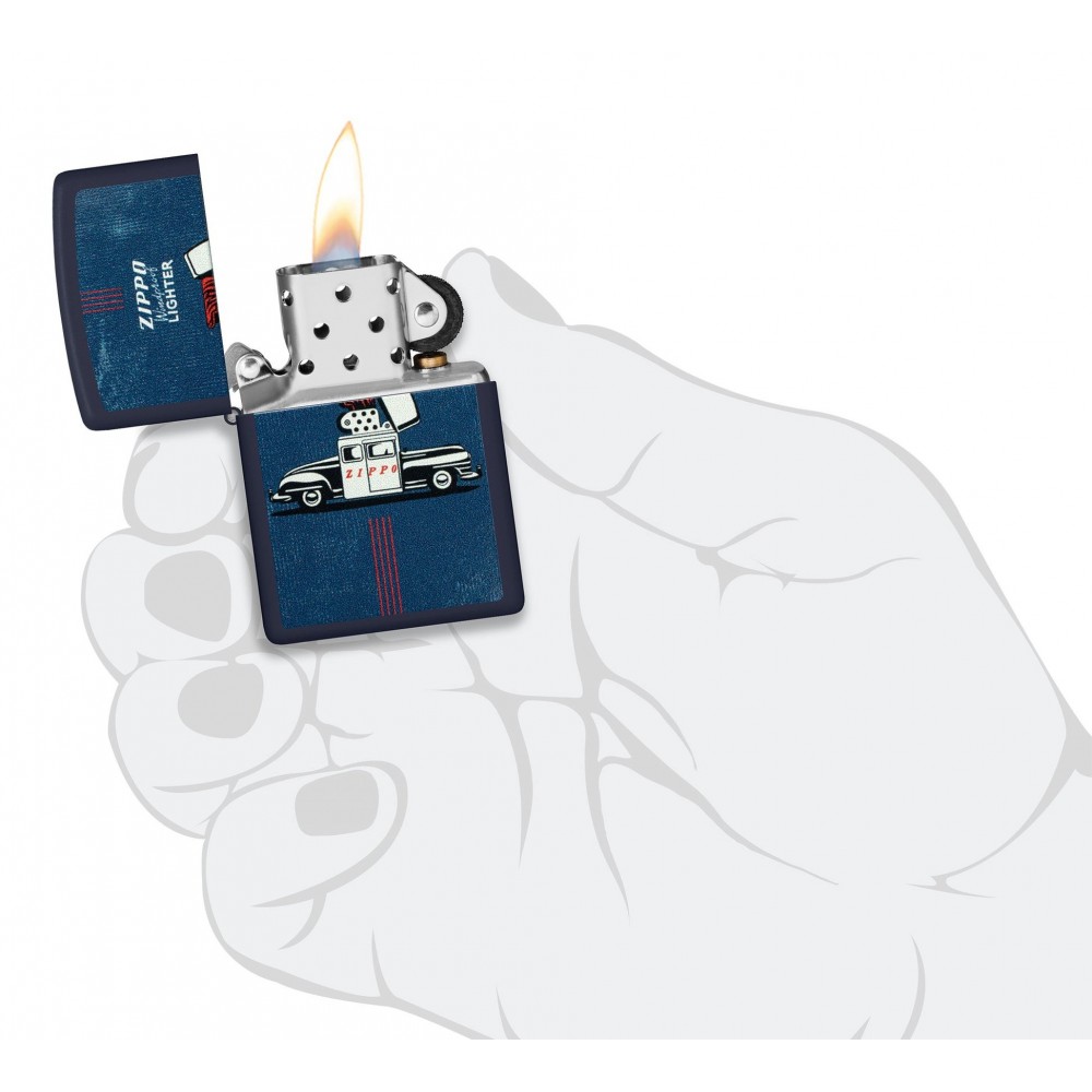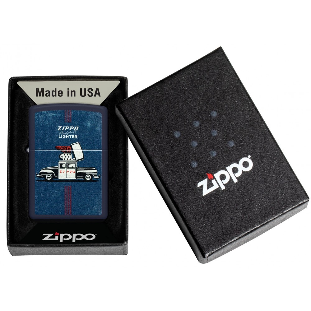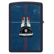 Šio klasikinio tamsiai mėlyno matinio žiebtuvėlio priekyje ir gale, pavaizduotas legendinis „Zippo“ automobilis visu savo grožiu.