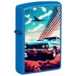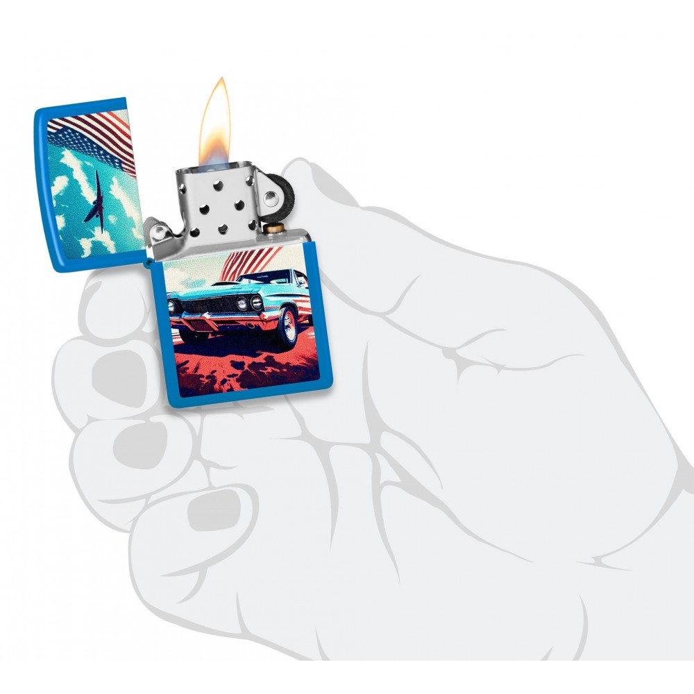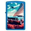 Šis klasikinis „Sky Blue Matte“ žiebtuvėlis su ryškiai mėlynu „muscle car“ automobiliu ir Amerikos vėliava pasiruošęs kitai jūsų kelionei.