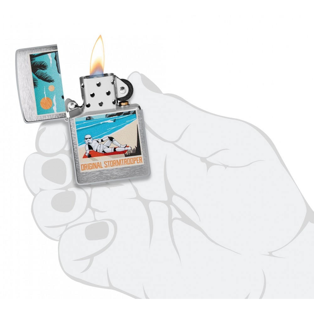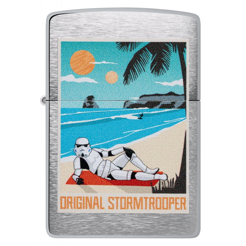 Turbūt labiausiai atpažįstama kovos jėga galaktikoje, legendinis originalus šturmo karys ("Storm trooper"), puikiai atrodo ant šio klasikinio šlifuoto chromo žiebtuvėlio. Ryškus spalvoto vaizdo dizainas vaizduoja mylimą šturmo karį, besiilsintį paplūdimyje.