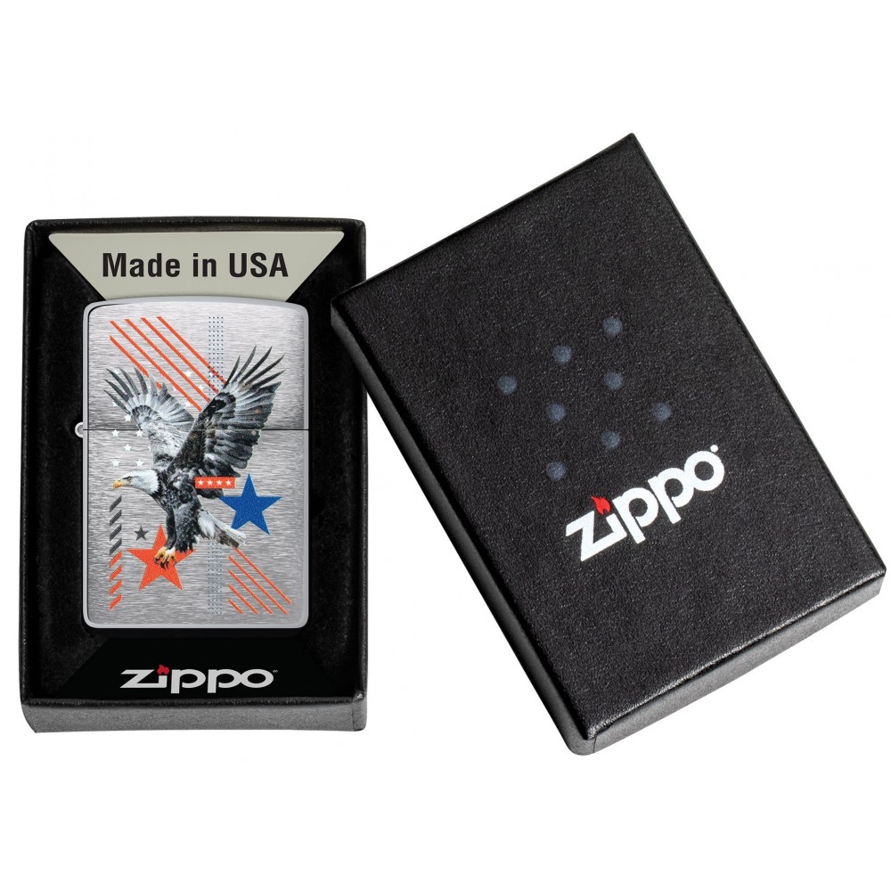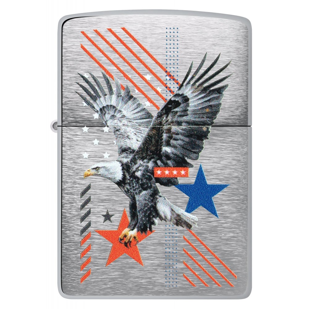 Fone – patriotinės žvaigždės ir juostos, karališka erelė sklendžia per šio klasikinio Brushed Chrome žiebtuvėlio paviršių drąsiame Color Image dizaine.