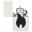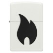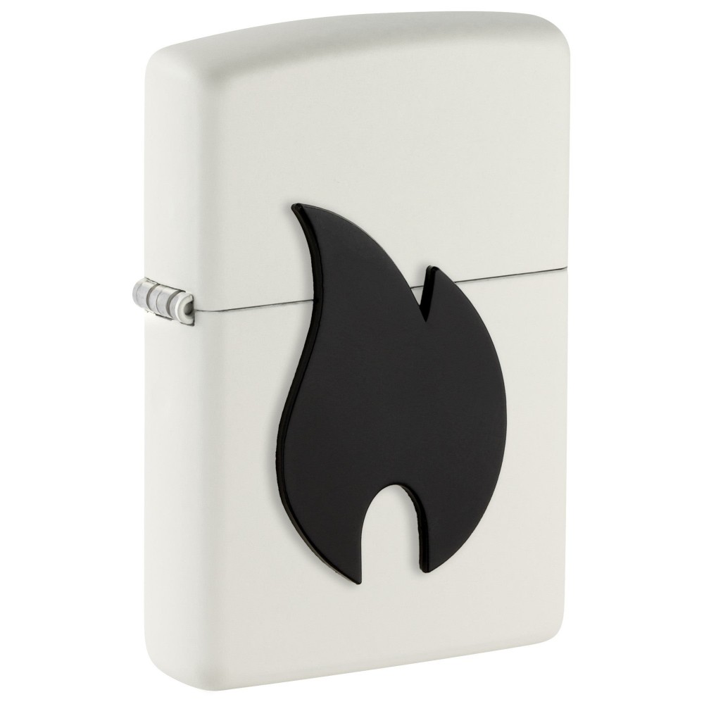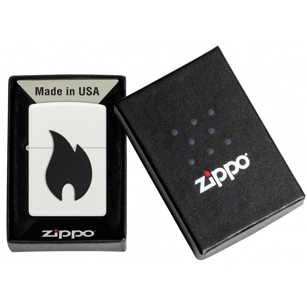 Šis klasikinis baltas matinis žiebtuvėlis pasižymi „Zippo“ liepsnos piktograma ant tamsiai juodos metalinės emblemos, kuri lieka savo vietoje atidarius žiebtuvėlį.
