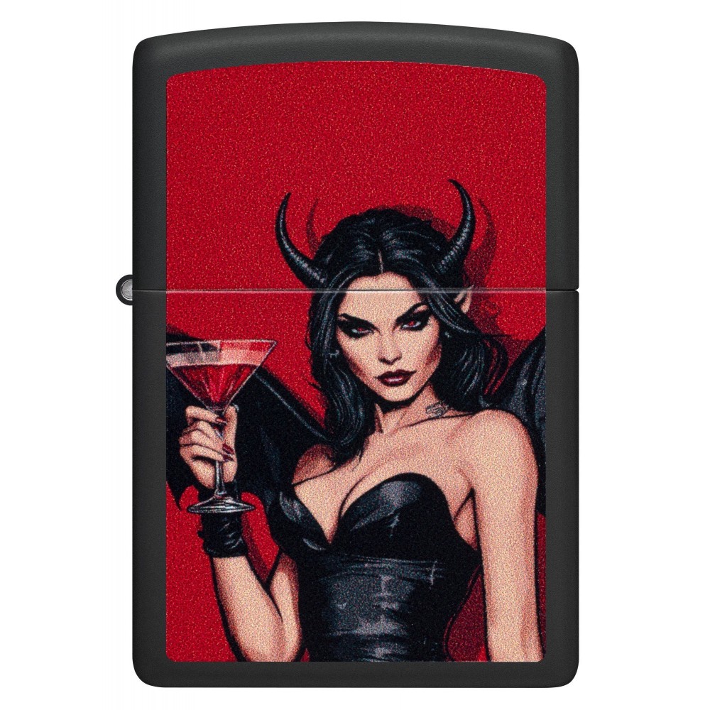 Laikydama martinio taurę, demoniška vampyrė pozuoja ant šio klasikinio „Black Matte“ žiebtuvėlio paviršiaus.