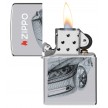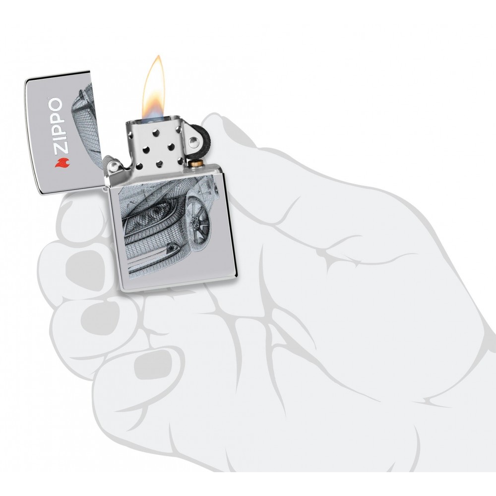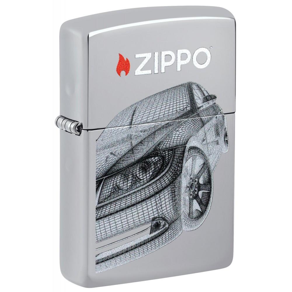 Pavaizduotas moderniu, skaitmenizuotu stiliumi, sportinis automobilis lekia į priekį ant šio klasikinio High Polish Chrome žiebtuvėlio, futuristiniame Color Image dizaine.