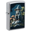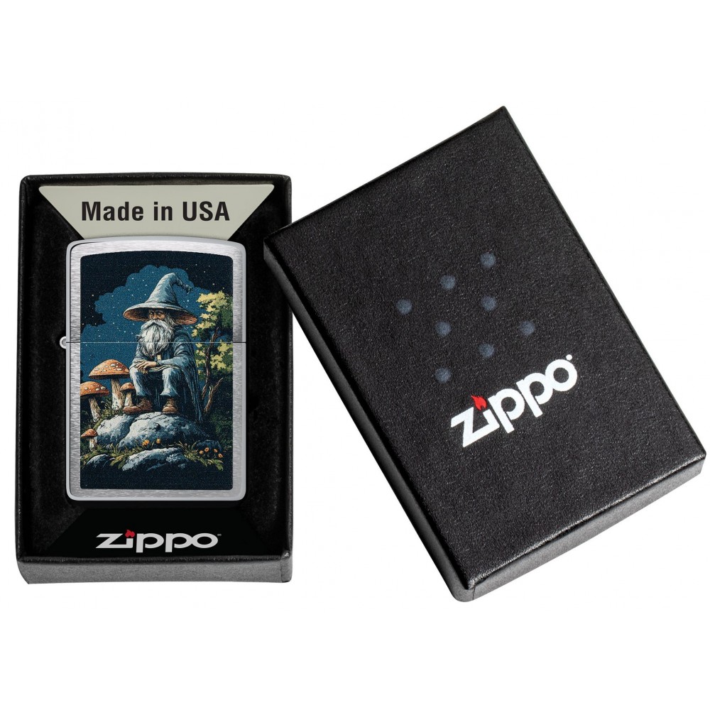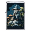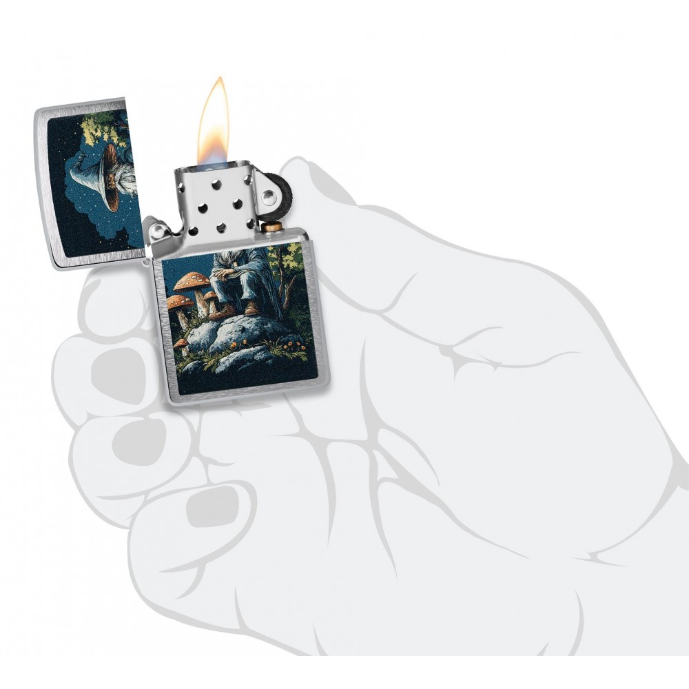 Tiesiai iš pasakų knygos, ant šio klasikinio šlifuoto chromo žiebtuvėlio paviršiaus, papuošto įnoringu spalvoto paveikslėlio dizainu, tarp grybų ir lapijos sėdi senas burtininkas.