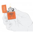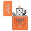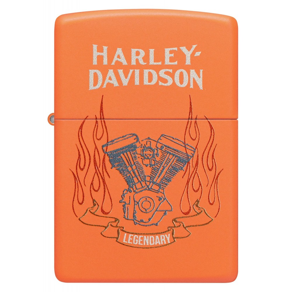 Ant šio klasikinio oranžinės matinės spalvos žiebtuvėlio, po „Harley-Davidson“ užrašu, jaudinančio spalvoto vaizdo dizaine pavaizduotas legendinis „Harley-Davidson®“ variklis, apsuptas mirgančių liepsnų ir užrašo „Legendary“.