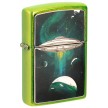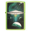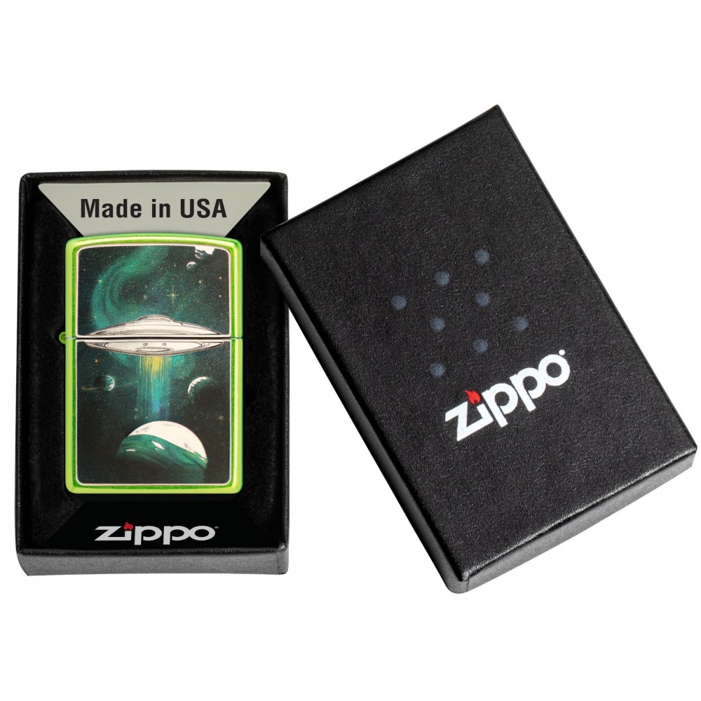 Šis klasikinis „Lurid“ žiebtuvėlis yra puikus fonas ryškiai metalinei emblemai, vaizduojančiai ateivio erdvėlaivį, metantį šviesos spindulį į nieko neįtariančią planetą.