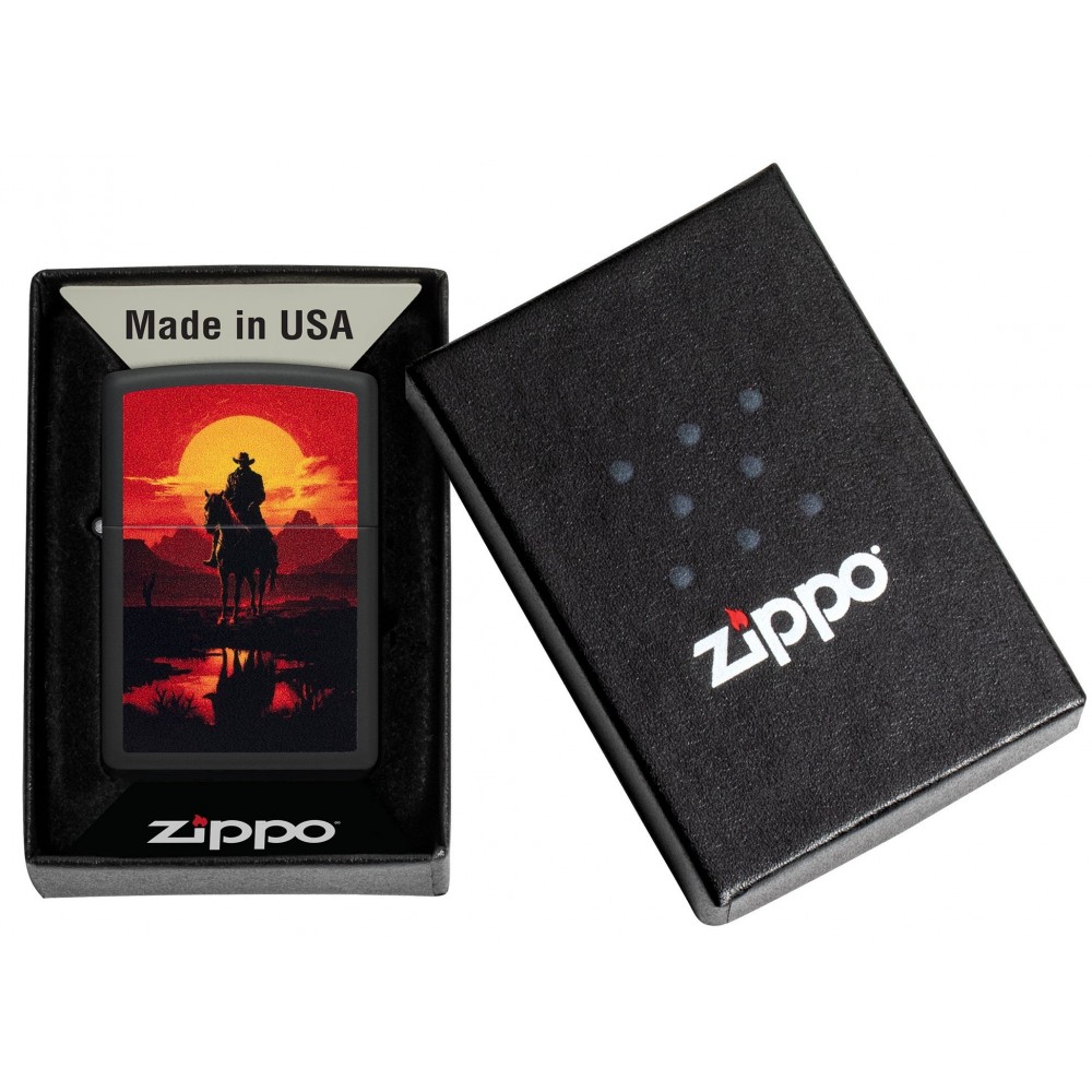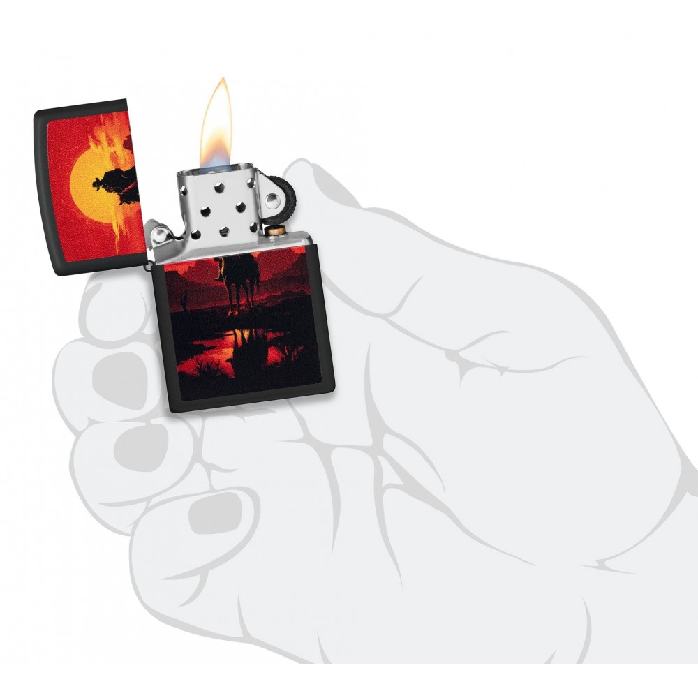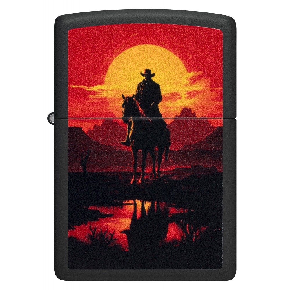 Fone degančios dykumos saulėlydžio, raitelis ant arklio pavaizduotas ant šio klasikinio Black Matte žiebtuvėlio paviršiaus ryškiame Color Image dizaine.