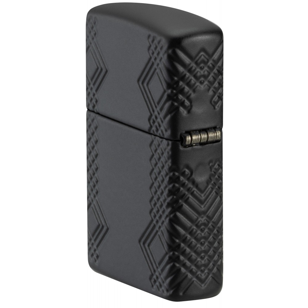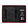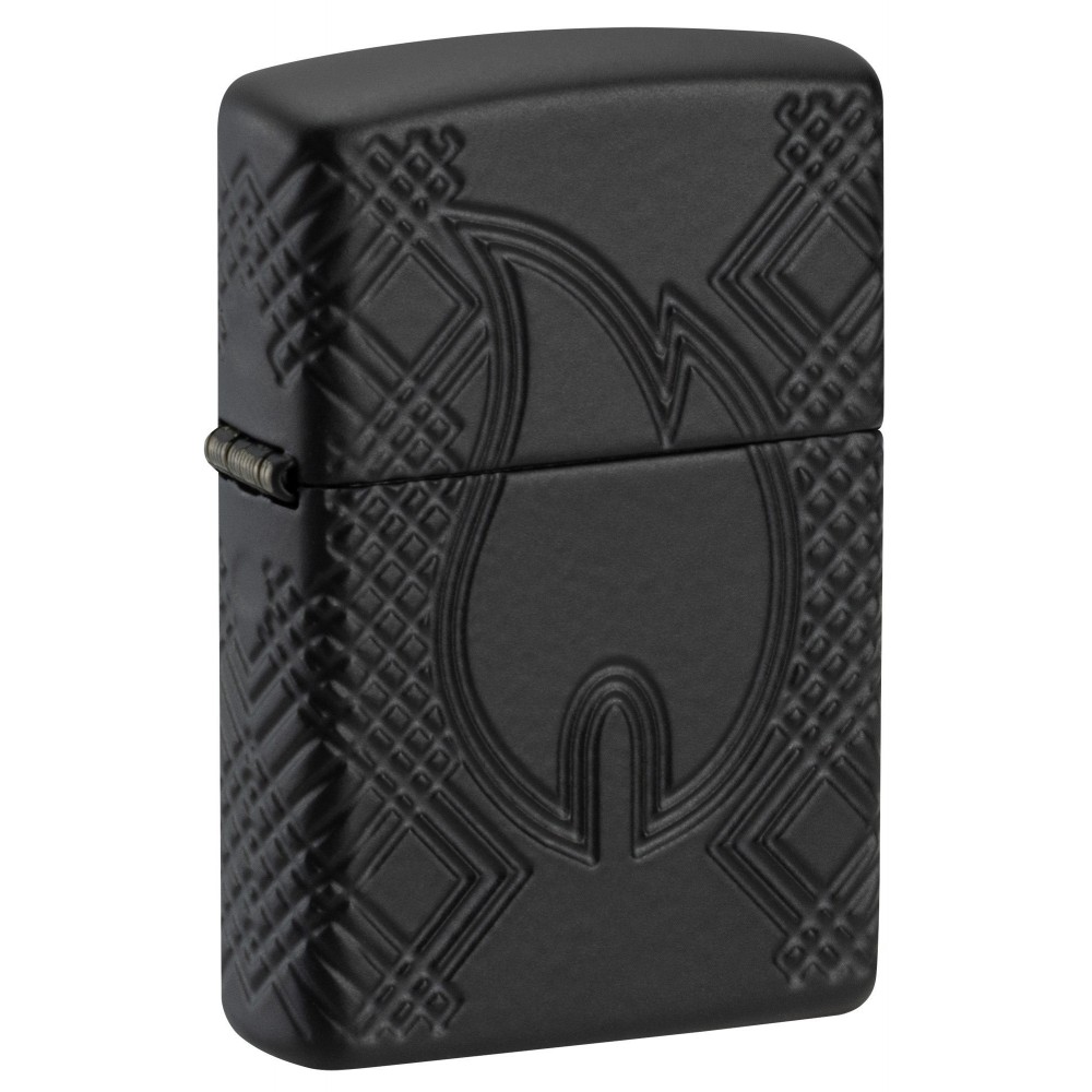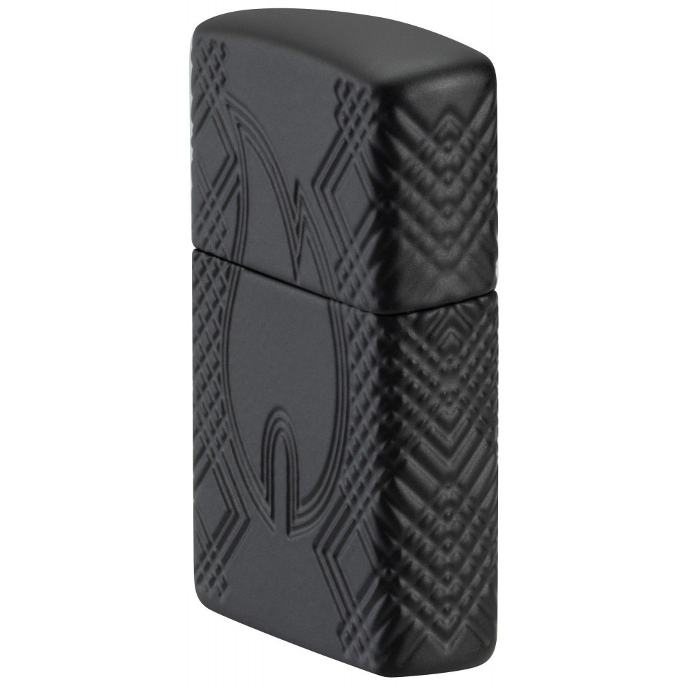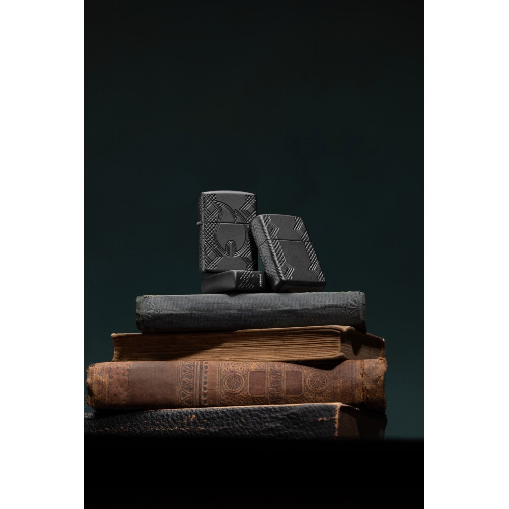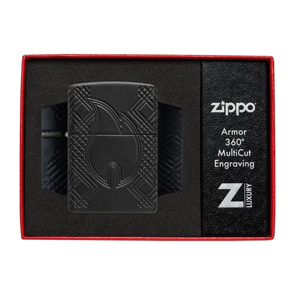 Zippo liepsnos piktograma yra apsupta turtingos tekstūros kniedžių motyvu ant šio Armor® Black Matte žiebtuvėlio, puošto prabangiu MultiCut dizainu, kuris tęsiasi aplink visas žiebtuvėlio puses.