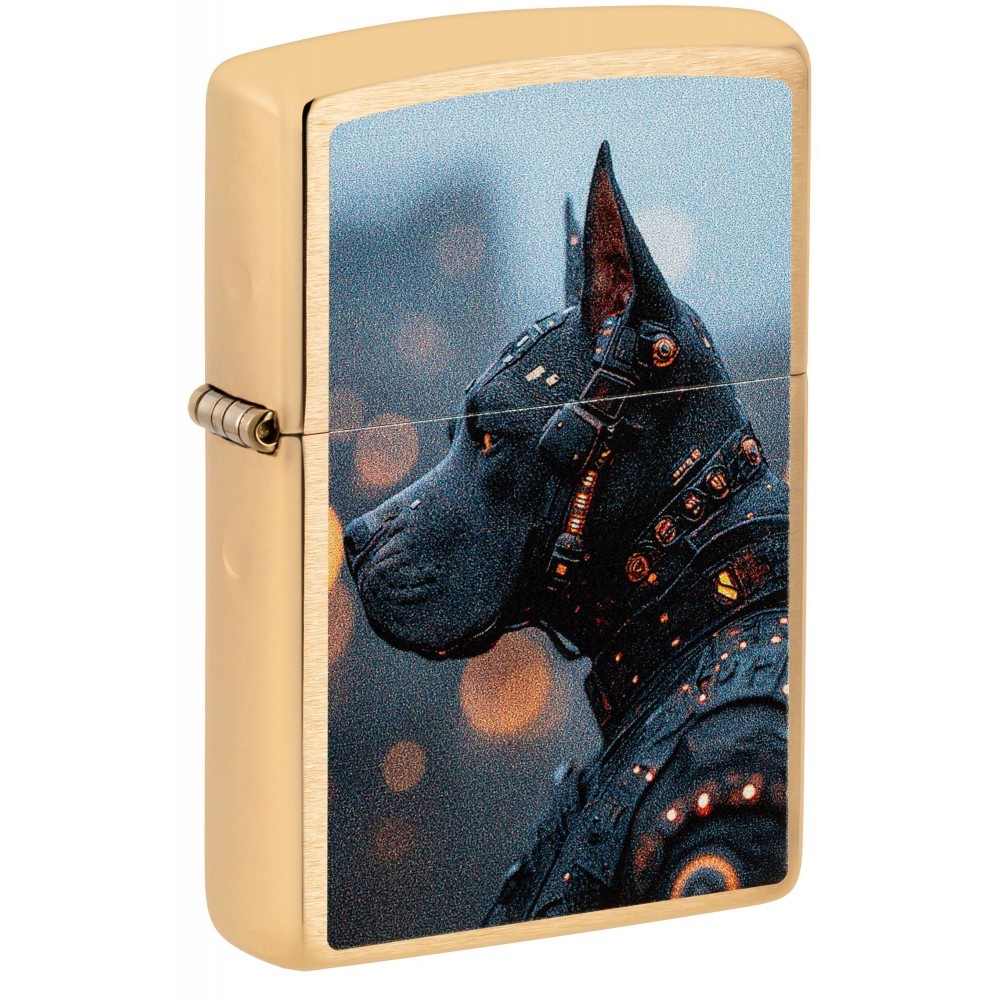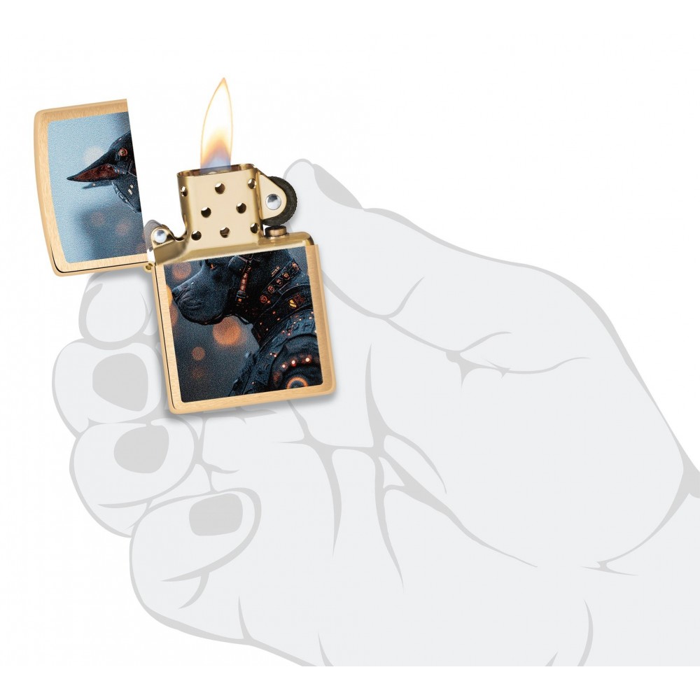 Šis klasikinis šlifuoto žalvario žiebtuvėlis pasižymi mechaniniu iltimi, futuristiniu spalvoto vaizdo dizainu.